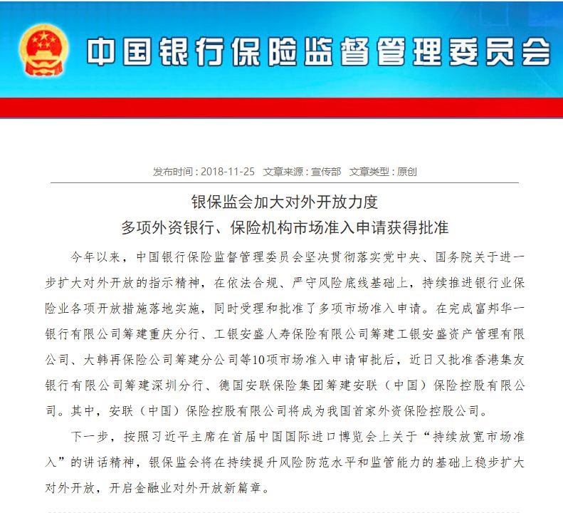 11月25日,中国银保监会发布信息显示,多项外资银行、保险机构市场准入申请获得批准。包括批准香港集友银行有限公司筹建深圳分行、德国安联保险集团筹建安联(中国)保险控股有限公司。其中,安联(中国)保险控股将成为我国首家外资保险控股公司。