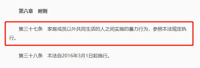 但是《中华人民共和国反家庭暴力法》附则第三十七条明确规定:家庭成员以外共同生活的人之间实施的暴力行为,参照本法规定执行。