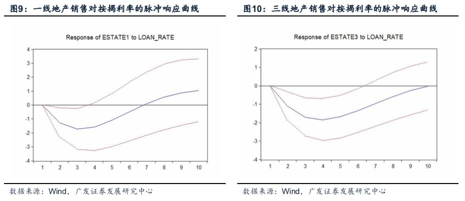 2.分区域来看,不同地区的销售数据对利率冲击呈现相似特征:受到按揭利率一个单位的正向冲击之后,全部地区销售数据均在第2期开始回落。而利率对于一线地区的销售冲击于第3期达到峰值,对二三线地区的销售冲击于第4期达到峰值。此后冲击效应逐步衰减,对三线地区的冲击影响于第10期趋近于零。