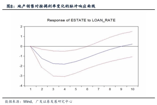 脉冲响应曲线:针对当期扰动项施加一个标准差的单位冲击之后,其对内生变量的当期和未来值所造成的影响。为确定按揭贷款利率对于地产销售的具体影响,我们基于SVAR模型得到的结果来计算商品房销售的脉冲响应函数。