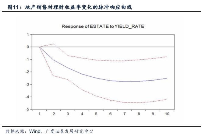 3.基于理财收益率冲击的脉冲响应曲线具有类似特征:受到理财收益率一个单位的正向冲击之后,地产销售于第2期开始出现回落并于第7期达到峰值,此后冲击效应逐步稳定,第10期之后依然保持在较高水平。理财产品收益率相比于按揭贷款利率更为敏感,拐点通常早于按揭利率先行出现,因此地产销售对其脉冲响应的峰值与持续性相对滞后。