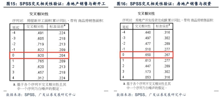 1-10月房地产投资增速录得9.7%,新开工面积同比录得16.3%,投资端表现较销售端呈现一定韧性。在此前的报告《房地产销售:基于按揭贷款利率的测算》中我们提到,地产销售或于明年一季度企稳,因而新开工以及投资端的判断尤为重要。根据SPSS交叉相关性验证结果:2015年之后的房地产销售与新开工、投资的领先关系较为模糊。因此销售企稳对投资端拐点以及趋势的影响,将是本部分探讨的重点。