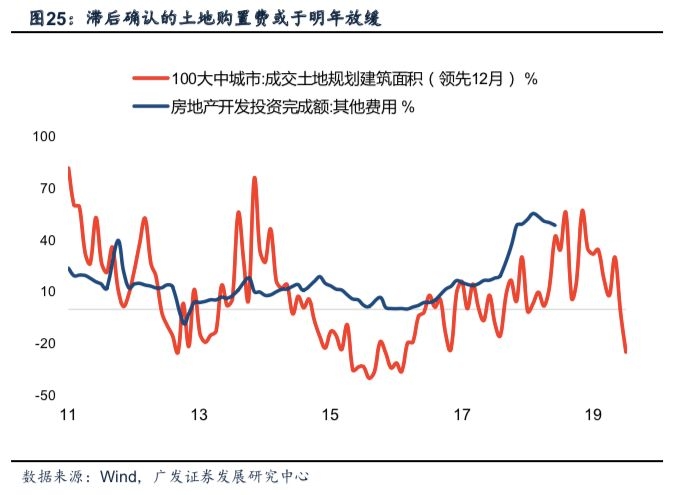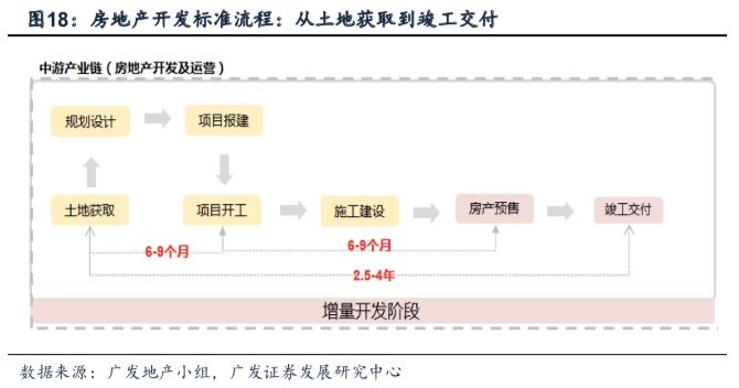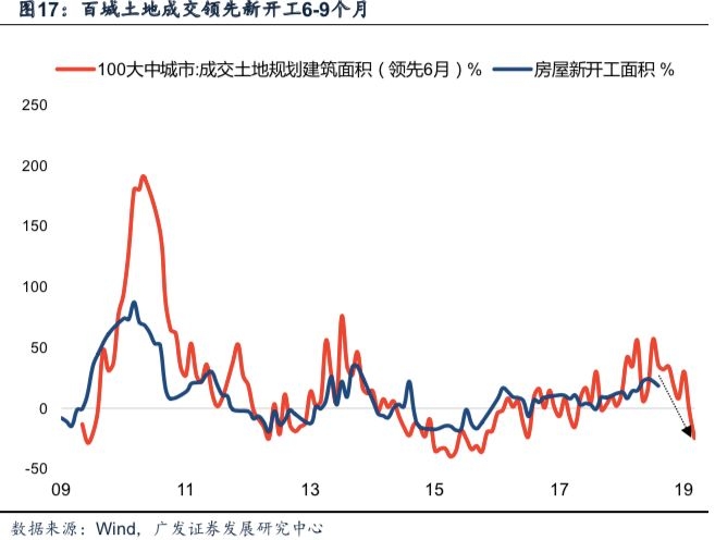 土地成交领先新开工6-9月。房地产新开工的领先指标为土地成交。标准的房地产开发流程包括:土地获取→项目开工→施工建设→房产预售→竣工交付五个步骤。土地获取到项目开发之间需经历规划设计与项目报建的过程,即土地成交对新开工有6-9个月的领先。今年一季度以来土地成交面积开始显著下滑,今年四季度将确认本轮新开工下行窗口。