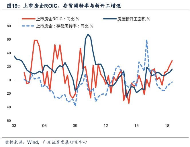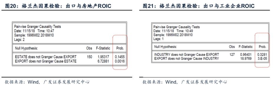 2.全行业ROIC支撑新开工。新开工高增的主因在于ROIC回暖而非高周转。当前市场主流观点认为:地产商为缓解经营压力主动采取快开工、快开盘、快回款的高周转模式。即讲求在拿地—开工—开盘—资金回笼过程中尽量压缩回款周期,项目达到预售标准并回款之后的施工则正常进行。从上市公司数据来看,前三季度房企存货周转天数确有所回落,存货周转率同比去年亦有所提升。值得注意的是,过去三轮房企存货周转率持续改善的阶段,均对应于全行业ROIC系统性回暖、尤其是出口表现相对强劲的时期。因此销售回落冲击下的房企高周转模式,本质上仍然依赖于宏观环境尤其是出口景气度。我们通过格兰杰因果检验对1996年至今的①银行代客结汇数据、②房企ROIC同比、③工业企业ROIC进行分析,结果显示:银行代客结汇数据在p=0.002,以及p=3*10^-5同时拒绝了原假设,表明出口景气度是工业企业、同时也是房企ROIC高增的主要原因。