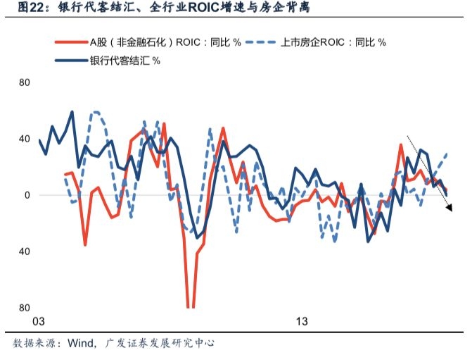 全行业ROIC支撑新开工。今年新开工高增的主因在于ROIC回暖而非高周转。过去三轮房企存货周转率持续改善的阶段,均对应于全行业ROIC系统性回暖、尤其是出口表现相对强劲的时期。因此销售回落冲击下的房企高周转模式,本质上仍然依赖于宏观环境尤其是出口景气度。考虑银行代客结汇已于今年一季度触顶,全行业ROIC去年底以来亦持续回落,叠加房地产销售拐点尚未显现,当前房企快周转支撑新开工的模式或在半年内难以持续。