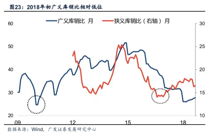 3.新开工或于明年下半年触底。10月新开工单月增速录得14.7%,下行斜率较三季度有所扩大,新开工何时触底成为关键变量。从行业层面考量,除土地历史成交以外,新开工还受到开发商开工意愿等因素影响。库存水平越低,开发商新开工意愿越强,因而库存去化周期的持续缩短是新开工的重要支撑因素。截止今年10月,重点城市已批未售的狭义库销比已降至17个月以内,累计新开工-累计销售面积所衡量的中期库销比降至28个月,仅次于10年初的历史低位。低库存背景下开发商新开工意愿较强。