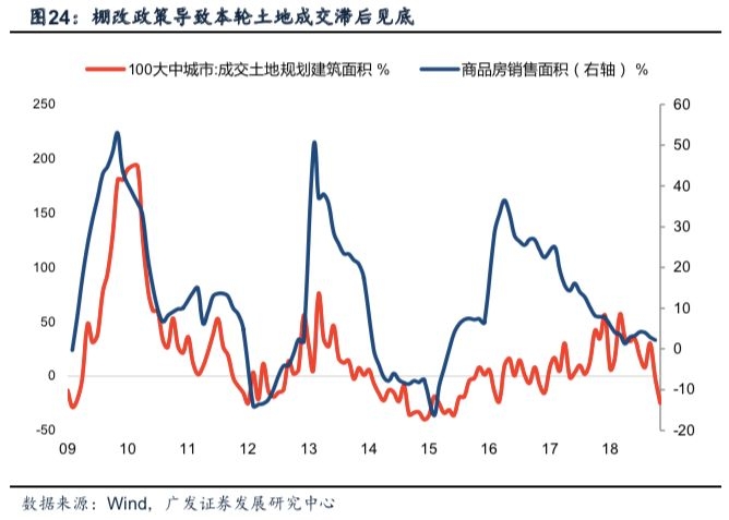 核心约束在于土地成交。预计一季度土地成交与销售同步触底,因而新开工或于明年三季度见底回升。历史上房地产销售与土地成交为同步指标,核心逻辑在于销售资金回笼后,地产商的首要安排即为拿地与竣工交付。纵观本轮历史:16年因城施策调控施行,一二线地区销售先后于17年初见顶,三四线景气度在棚改政策下得以阶段性延续,体现在数据上即为成交见顶时点滞后销售达24个月。似乎本轮销售与成交的同步特征存在背离,但值得注意的是三轮地产周期的底部区域,09年、12年以及15年土地成交与地产销售均同时回暖,表明利率变化与政策放松对两者产生决定性影响。考虑到19-20年棚改安置比例回归正常水平,土地成交伴随部分城市销售于一季度触底为大概率事件,因而滞后确认的新开工与投资或在明年呈现前低后高趋势,低点缓和窗口大概率落在三四季度。