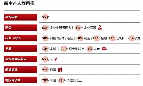 报告对新中产给出了一个新的定义。我国新中产的平均年龄在35岁,家庭年收入均值 65 万元,获得本科及以上良好教育,更偏爱金融投资、TMT等热门行业,已晋升为企业管理层或从事专业性自由职业。他们大多已成家并育有子女,父母安康,有房有车。并且无论是物质生活还是精神生活都要求不断修己,不愿落于人后。
