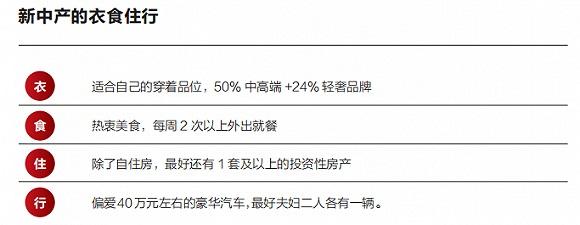 在衣食住行方面,衣,选择50%中高端和24%轻奢品牌;食,每周2次以上外出就餐; 住,除自住房,最好还有一套以上的投资性房产;行,偏爱40万元左右的汽车,最好夫妇二人各一辆。