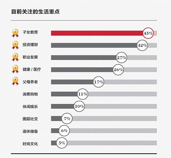 在新中产关注十大生活重点中,子女教育和投资理财位居前两位。
