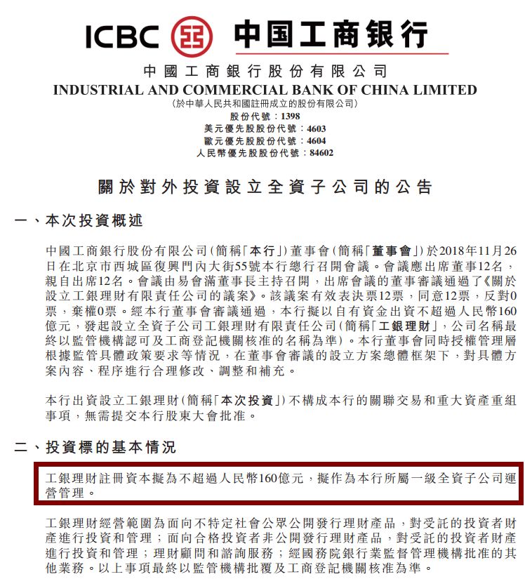 宇宙大行工商银行发布公告,拟以自有资金出资不超过人民币160亿元,发起设立全资子公司工银理财有限责任公司。(简称「工银理财」,公司名称最终以监管机构认可及工商登记机关核准的名称为准)。