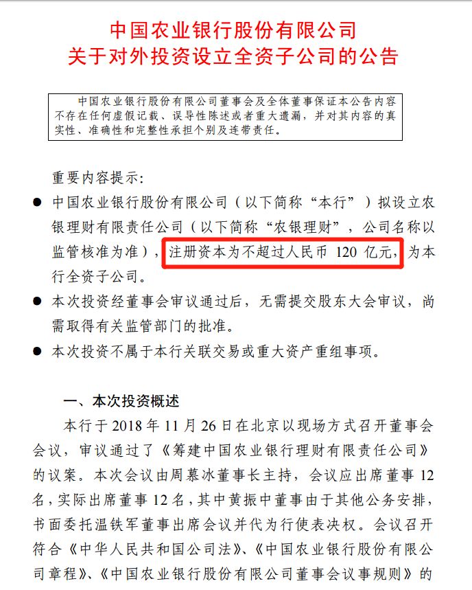 而在工行发出设立银行子公司的1个小时前,农业银行刚发布公告,拟出资不超120亿元投资设立农银理财有限责任公司(简称农银理财,名称以监管核准为准)。