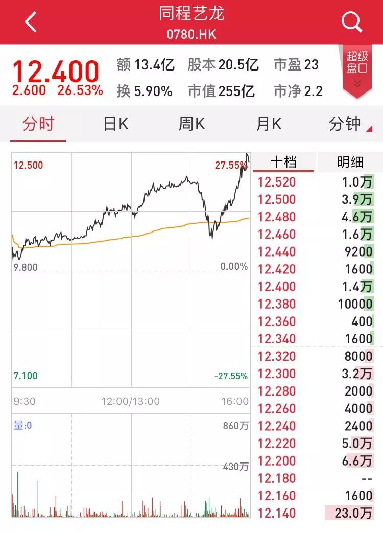 同程艺龙上市终于尘埃落定。今日上午,同程艺龙正式挂牌港交所,开盘价10.78港元,较发行价9.80港元上涨10%,截止收盘,该股报收12.40港元,全天涨幅达26.53%,市值达255亿港元。