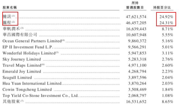 值得注意的是,同程艺龙的上市,腾讯和携程这两大“金主”或成最大赢家。目前,腾讯持有同程艺龙24.92%股份,为同程艺龙第一大股东,携程持股比例24.31%,为第二大股东,二者持股比例很是接近。