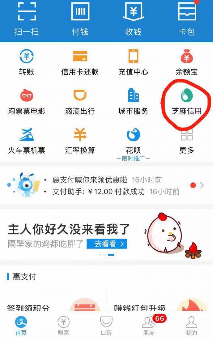 具体操作步骤为,在支付宝页面点击芝麻信用: