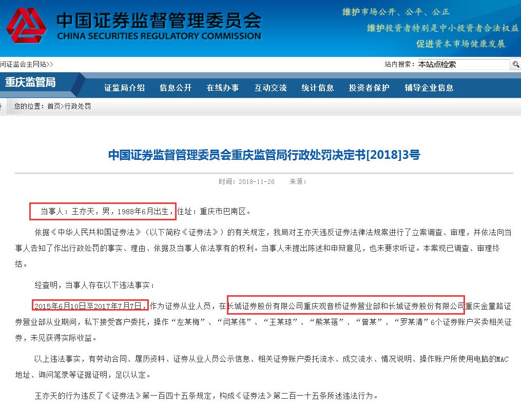 11月26日,重庆证监局发布一则行政处罚决定书,对长城证券从业人员王亦天违规代客操作作出罚款10万元的决定。