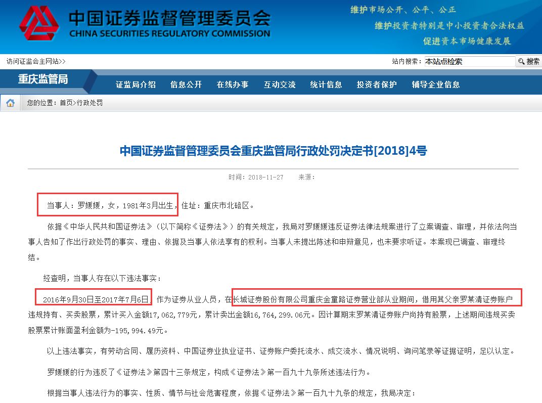 11月27日即今天,重庆证监局又发布一则行政处罚决定书,对长城证券从业人员罗媛媛借用其父亲证券账户违规持有、买卖股票的行为作出罚款10万元的决定。