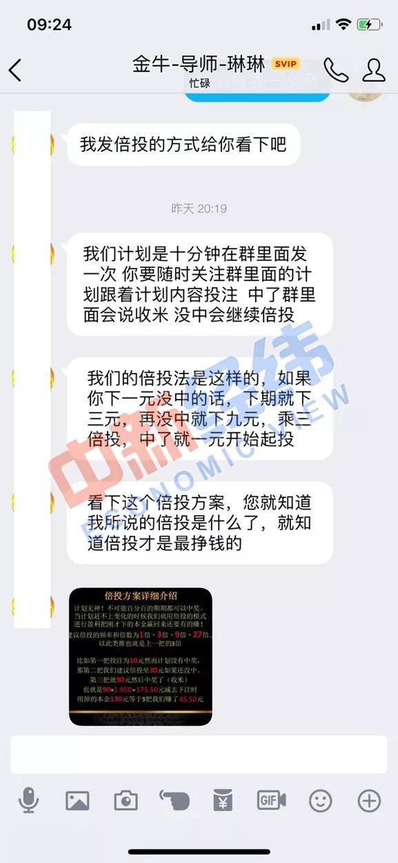“风”提供的玩法更为“高级”。“风”让中新经纬添加“金牛-导师-琳琳”的QQ号,在这名“导师”的指导下参与下注。在前两次投注均未中奖后,“金牛-导师-琳琳”就建议通过“倍投方案”投注。按照他们的设计,第一次投10元,如果没有中奖,第二次就投30元;第二次也没有中奖,第三次就投90元,第三次一定能中,而且还能将本金收回。