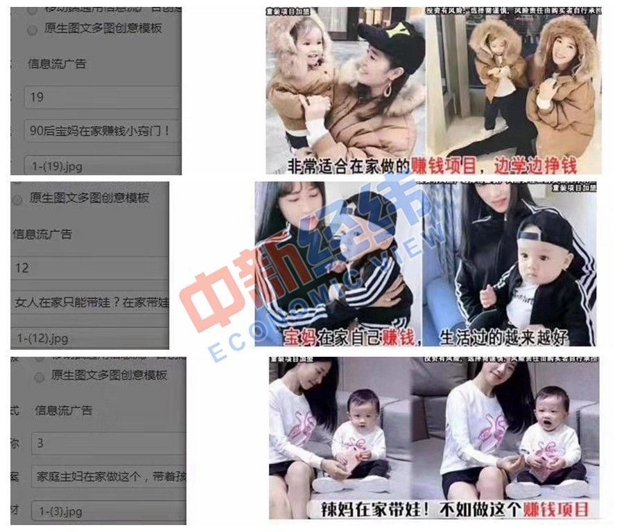 小程随后发来了三张已在爱奇艺投放的网赚广告素材,“辣妈在家带娃!不如做这个项目赚钱”“宝妈在家自己赚钱,生活过的越来越好”“非常适合在家做的赚钱项目,边学边赚钱”的文字表述,与中新经纬遇到的博彩类广告推广十分相似。小程称,很多做时时彩的客户都是用的网赚广告引导,使用这些“网赚”页面投放广告,只要内容上不提及“彩票”,都可以通过。