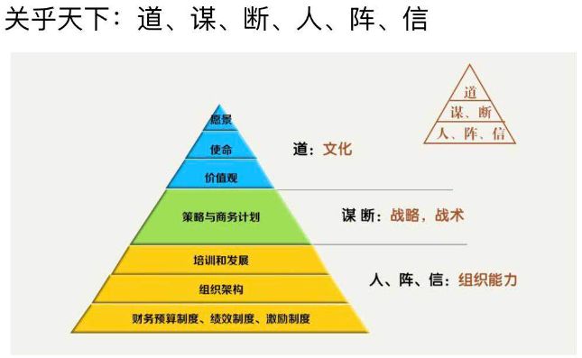 在阿里巴巴的组织中有一个非常核心的框架,是阿里第一任COO关明生提出的,他说一家企业的成功叫做关乎天下,简单来说就是道、谋、断、人、阵、信。
