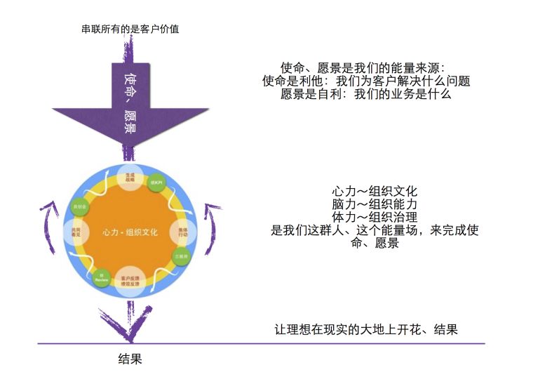 我们再来看结果,结果是什么?结果就是客户价值衍生的结果。因为实现了客户价值企业所得到的盈利和各方面的收入,这个叫做结果。让理想在现实的大地上开花结果,这个就叫做地。中间是什么呢?就是从客户价值衍生出来的使命愿景加上这个组织的循环,这个理念叫人。