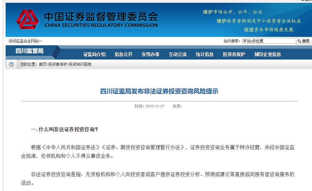 而近日,四川证监局发布非法证券投资咨询风险提示,提醒投资者不要抱有一夜暴富、天上掉馅饼的幻想,面对非法投资活动时保持理性,自主作出投资决策。