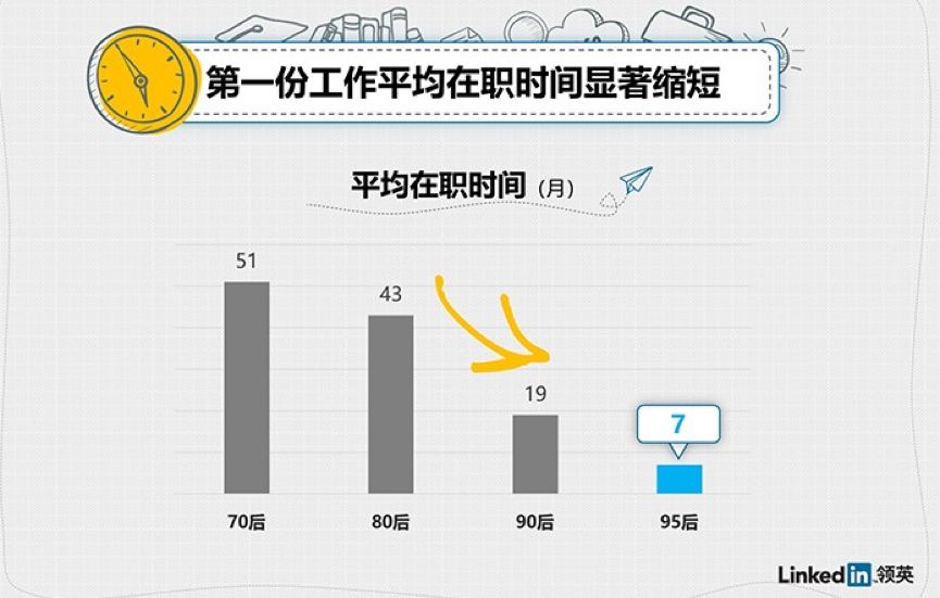 职场社交平台LinkedIn(领英)发布的《第一份工作趋势洞察》显示,95后第一份工作平均在职时间仅为7个月,比90后整整缩短一年,那些更能忍受责骂的80后,首份工作平均在职时间高达43个月。