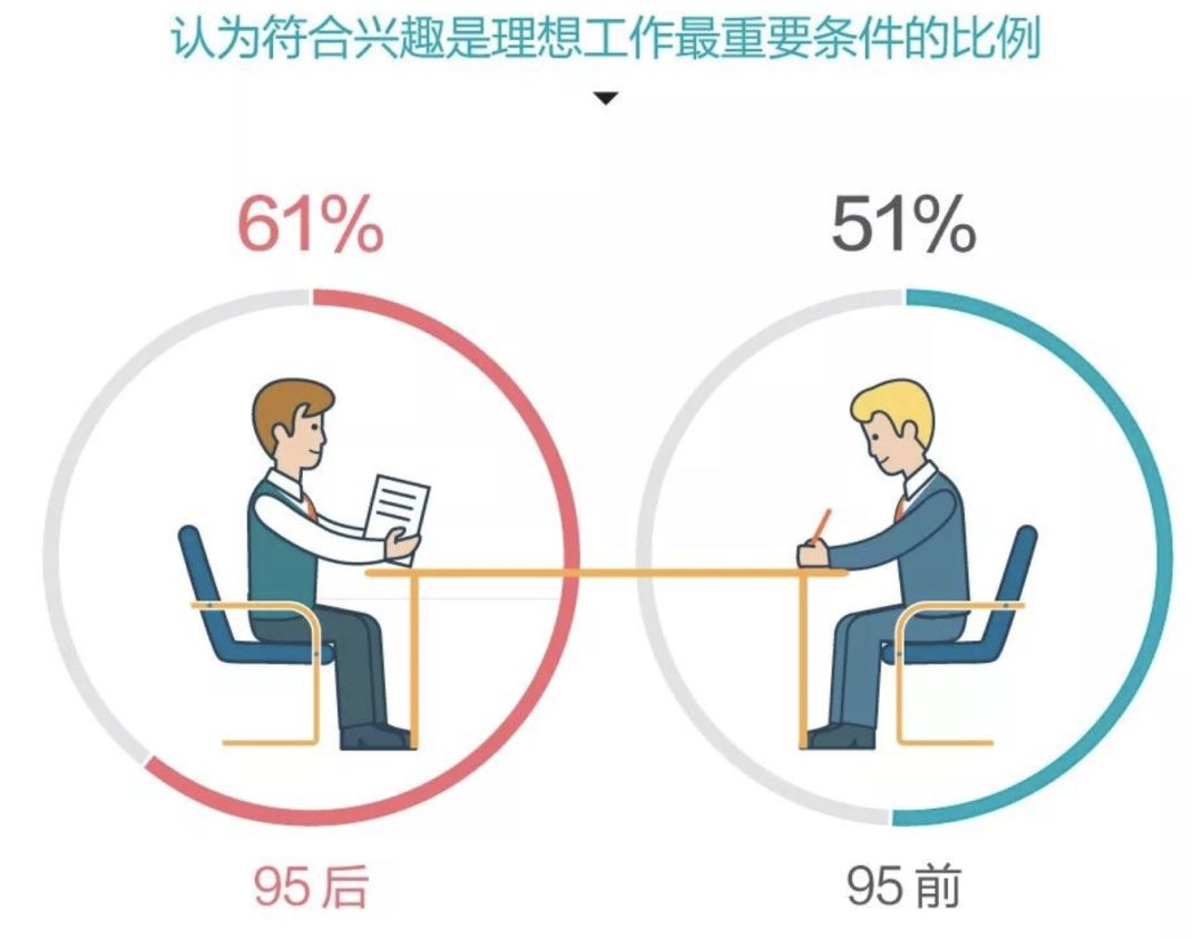 兴趣是95后选择职业的首选条件。智联招聘发布的报告显示,在2017年、2018年应届毕业生中,IT/通信/电子/互联网,是毕业生期望签约与实际签约领域的双料冠军。也就是说,95后更喜欢工作环境开放、宽松的互联网行业。