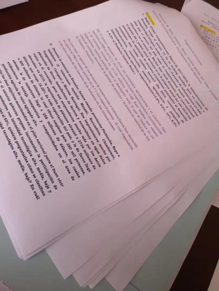 坎帕纳部长今年只有46岁,是厄瓜多尔深具发展潜力的政治家。采访之前,我就该部所负责的生产、外贸与投资三大领域准备了16个问题的采访提纲。见到坎帕纳部长之前,他的新闻主任Daniela交给我一份部长为此准备的回答,长达12页,还配有图表,非常专业。