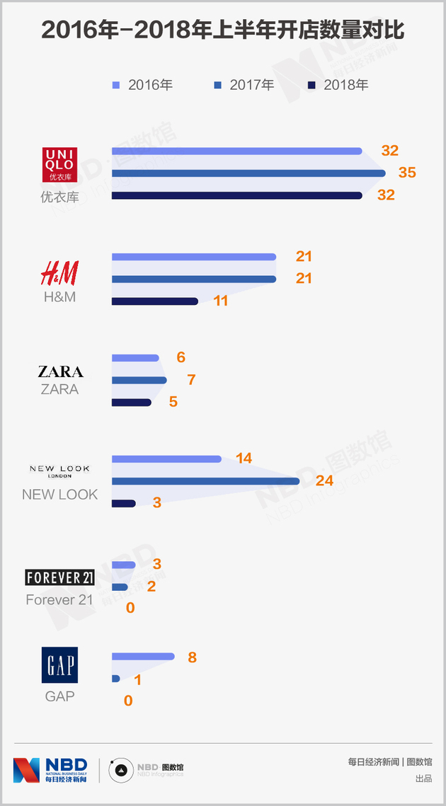 与国产服装品牌的崛起相对的是,那些在国际上早有影响力,并已布局中国的国际时尚服装品牌却放慢了自己发展的脚步。包括H&M、ZARA、UNIQLO优衣库、NEW LOOK、Forever 21、GAP在内的6家国际品牌在2018年上半年开店速度呈现下降趋势。