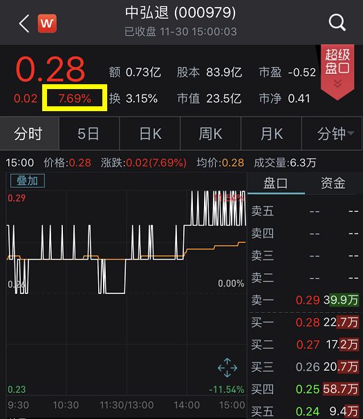 而今天,0.26元的中弘退从0.26元到0.29元,4分钱的“心跳图”玩了一天。最终大涨7.69%至0.28元。数据显示,成交额超7254.9万元,换手率达3.15%。