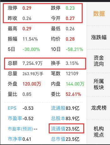 仅剩0.26元的中弘退能一眼望尽涨跌停板价,其涨停或跌停都只有3分钱,加上平盘价才7个价位。