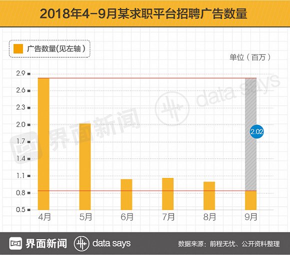 与此同时,今年4至9月,前程无忧发布的招聘广告数量从285万条降至83万条,共有202万条招聘广告消失。