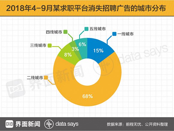 从城市分布看,在消失的202万条招聘广告中,来自成都、杭州、武汉等45个二线城市的占比高达68%,来自北上广深四个一线城市的占比仅为15%。