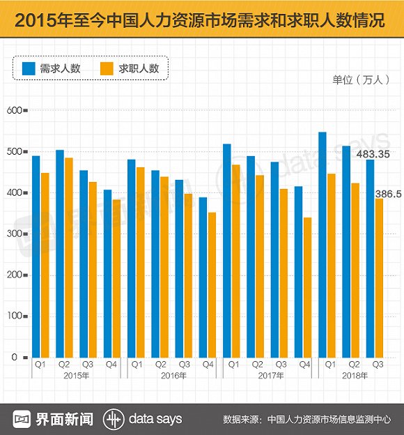 根据人力资源和社会保障部(简称“人社部”)数据,2018年前三季度中国就业形势总体稳定,市场需求略大于供给。从供求总量看,与去年同期相比,需求人数增加了3.7万人,增长0.8%;求职人数减少了31.4万人,下降7.5%。