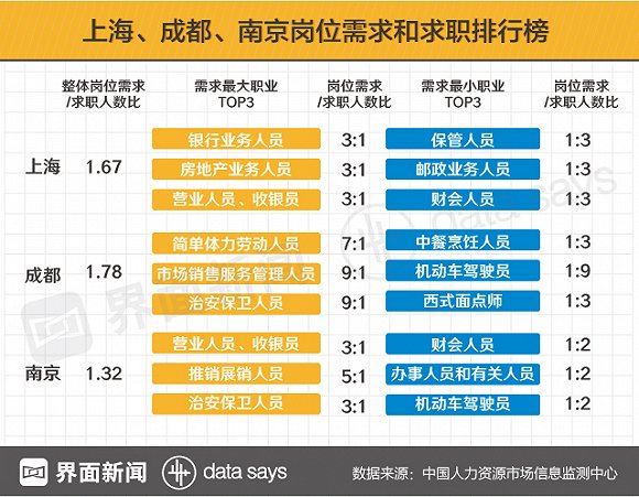 从职业看,在上海、成都和南京三个城市,简单体力劳动人员、推销展销人员、营业人员、收银员、治安保卫人员等职业的用人需求较大,财会人员、保管人员、机动车驾驶员、中餐烹饪人员等职业的用人需求相对较小。