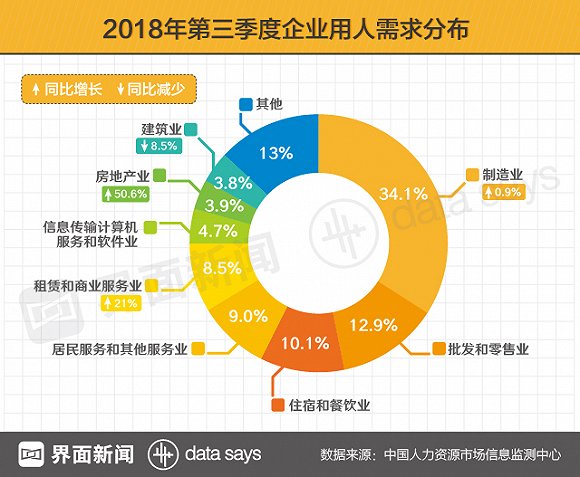 根据中国人力资源市场信息监测中心对90城公共就业服务机构市场供求信息统计,2018年第三季度,57.6%的企业用人需求集中在制造业(34.1%)、批发和零售业(12.9%)、住宿和餐饮业(10.1%)。其中,房地产业用人需求增幅较大,达50.6%。