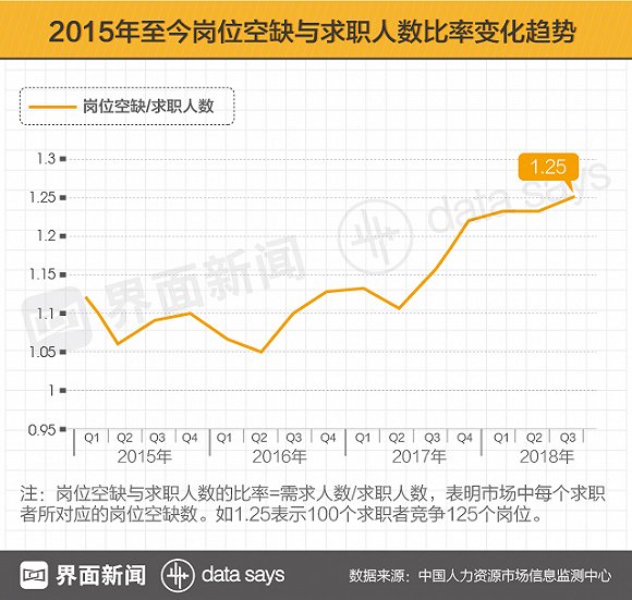 2018年第三季度岗位空缺与求职人数比率为1.25,创2015年来新高。