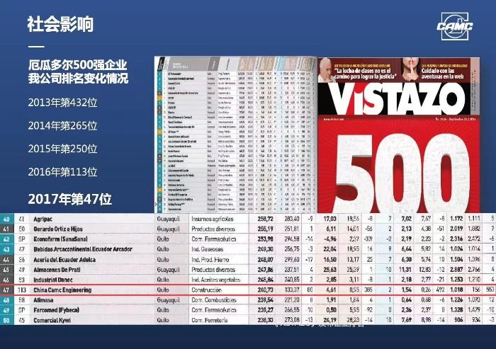 总的来说,过去8年间,中工国际厄瓜多尔分公司共完成13个工程承包项目,其中10个为政府框架项目,两个现汇项目,一个发展援助项目。2017年中工国际厄瓜多尔分公司在厄瓜多尔500强企业中位列第47位,该评价指标体系包括收入、利润、税收、员工等,同年他们位列厄瓜多尔建筑类企业第一位。