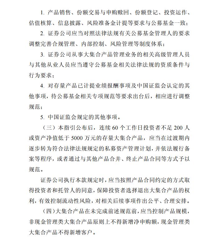 根据监管要求,大集合产品在未完成规范前,应当控制产品规模,其中,非现金管理类大集合产品原则上不得新增净申购额,现金管理类大集合产品不得新增客户。
