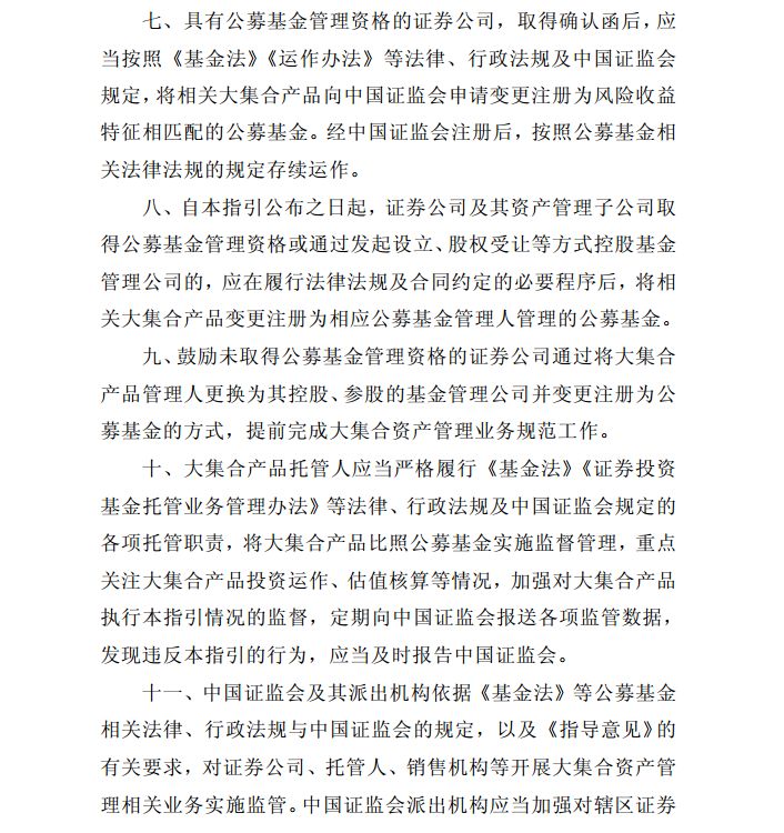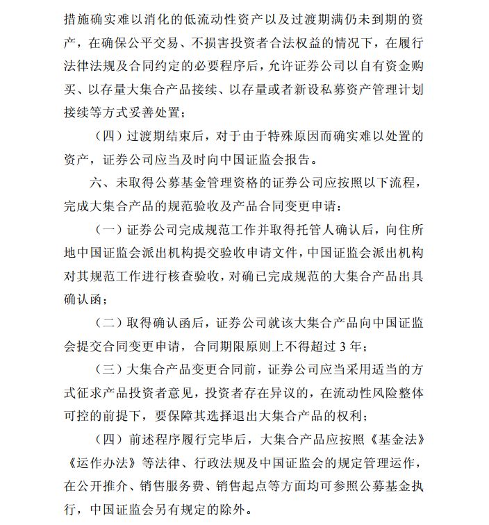 证监会表示,鼓励未取得公募基金管理资格的证券公司通过将大集合产品管理人更换为其控股、参股的基金管理公司并变更注册为公募基金的方式,提前完成大集合资产管理业务规范工作。