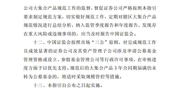 证监会表示,将按照市场“三公”原则,对完成规范工作且成效显著的券商或券商资管子公司涉及申请公募基金管理资格或设立、参股基金管理公司等行政许可事项,在审核进度方面予以优先支持。规范后的大集合产品3 年合同期届满仍未转为公募基金的,将适时采取规模管控等措施。