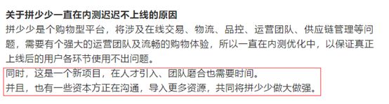 拼少少回复:这是一个新项目,在人才引入、团队磨合也需要时间。并且,也有一些资本方正在沟通,导入更多资源,共同将拼少少做大做强。