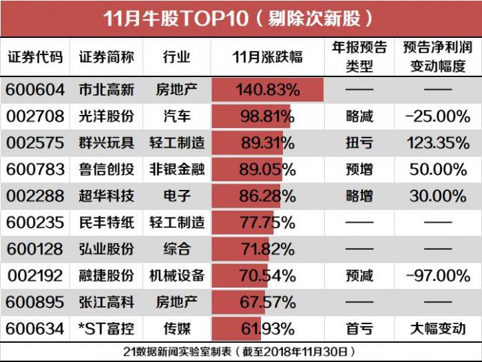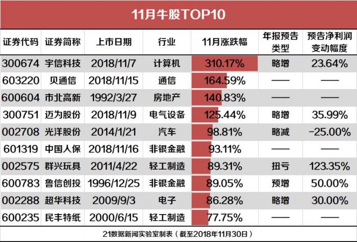 11月有8只新股上市,除29日、30日上市的4股外,其余4股均进入牛股TOP10,只是,目前均已打开涨停板。