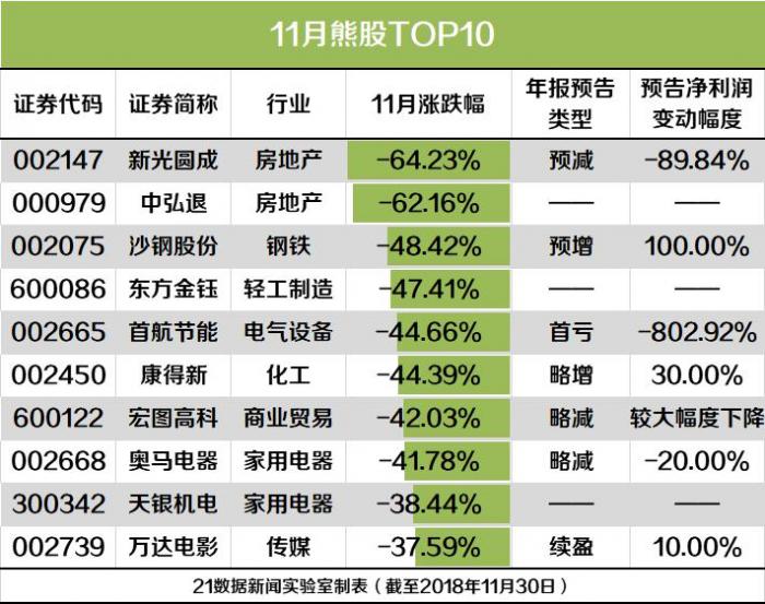 除了即将退市的中弘股份外,11月股价跌幅逾60%的还有身陷股东债务危机的新光圆成。