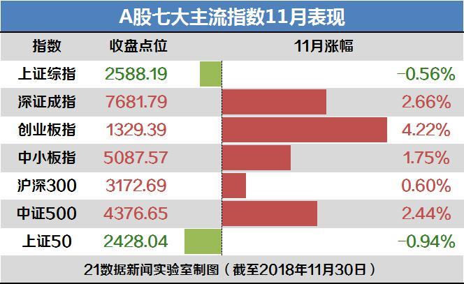 从各大主流指数表现来看,与10月全军覆没的情况不同,11月虽然上证综指小幅下跌0.56%,但深证成指和创业板指、中小板指纷纷飘红,其中表现最好的创业板指月涨幅4.22%。