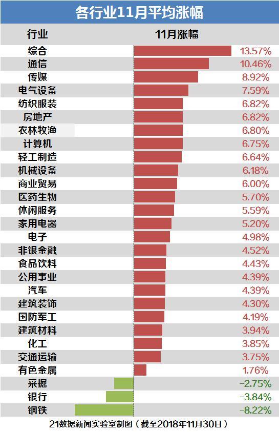 对比过去两个月各行业涨跌情况,有点风水轮流转。10月抗跌的钢铁、银行、采掘成为11月仅有的三个收阴行业。表现最好的为综合类、通信、传媒,月涨幅在10%左右。