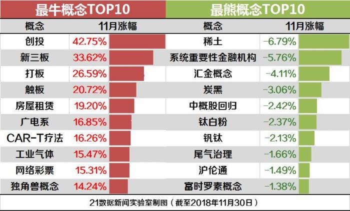 其中,受设立科创板的消息刺激,创投板块11月大涨42.75%,成为表现最好的概念。14个主题概念出现下跌现象,表现最差的为10月抗跌的稀土概念,整个11月累计下跌6.79%。
