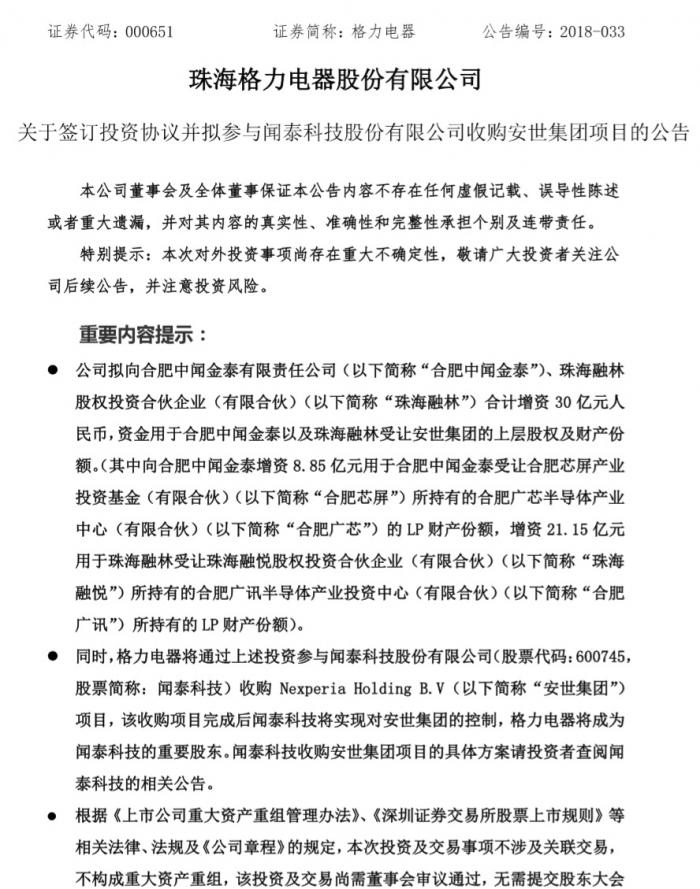 根据最新公告,格力电器将出资21.15亿元至安世集团上层LP之一——珠海融林,另外还将增资8.85亿元到闻泰科技的收购主体公司合肥中闻金泰,合计出资30亿元。交易后,格力电器成为闻泰科技的重要股东及投资人,预计直接持股2.94%,珠海融林预计持股7.57%。
