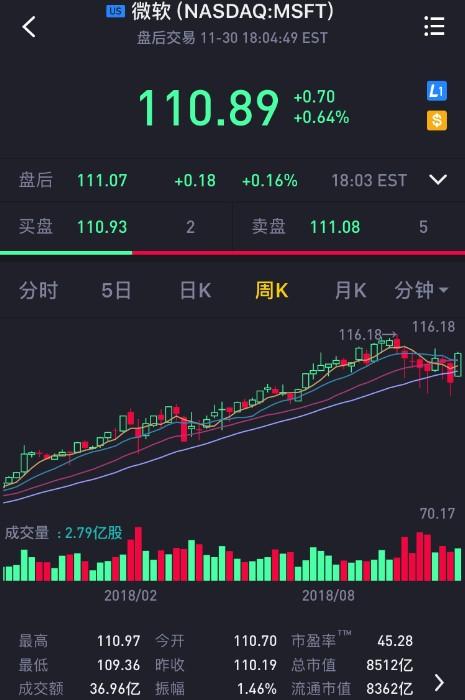 在美东时间周五的美股交易中,微软收涨0.64%,报110.89美元,市值8512.16亿美元。苹果收跌0.54%,报178.58美元,市值8474.34亿美元。